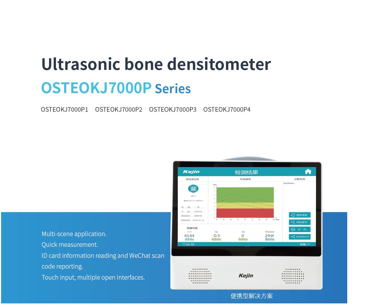 OSTEOKJ7000P Series Portable BMD is a portable solution launched by Kejin. It uses axial reflection technology to measure the speed of sound (SOS) along the direction parallel to the patella or phalanx, and calculates a set of parameters to reflect bone quality.