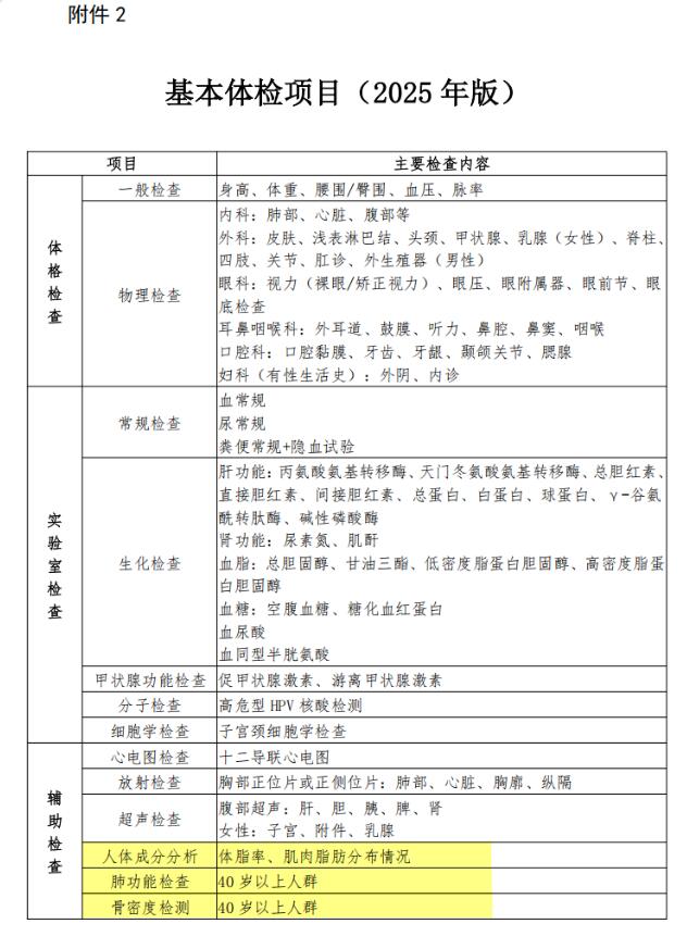 2025年11月4日,國家衛(wèi)生健康委辦公廳正式發(fā)布《成人健康體檢項目推薦指引(2025年版)》(以下簡稱《指引》),明確提出在成年人健康體檢中,應(yīng)進行體格檢查、實驗室檢查和輔助檢查,并將 人體成分分析 列入成人基本體檢項目,同時強調(diào) 40歲以上人群需增加肺功能檢查和骨密度檢測。